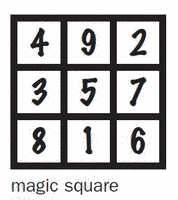 Magic Square. That's a sequence of consecutive positive numbers in a chessboard style formation, so that each row, each column, and each of the two diagonals will add up to the same Magic total: 50.
