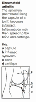 | Noun | 1. | rheumatoid arthritis - a chronic autoimmune disease with inflammation of the joints and marked deformities; something (possibly a virus) triggers an attack on the synovium by the immune system, which releases cytokines that stimulate an inflammatory reaction that can lead to the destruction of all components of the jointvirus - (virology) ultramicroscopic infectious agent that replicates itself only within cells of living hosts; many are pathogenic; a piece of nucleic acid (DNA or RNA) wrapped in a thin coat of protein arthritis - inflammation of a joint or joints autoimmune disease, autoimmune disorder - any of a large group of diseases characterized by abnormal functioning of the immune system that causes your immune system to produce antibodies against your own tissues psoriatic arthritis - a form of rheumatoid arthritis usually affecting fingers and toes and associated with psoriasis juvenile rheumatoid arthritis, Still's disease - a form of rheumatoid arthritis that affects children; large joints become inflamed and bone growth may be retarded |