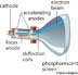 | Noun | 1. | cathode-ray tube - a vacuum tube in which a hot cathode emits a beam of electrons that pass through a high voltage anode and are focused or deflected before hitting a phosphorescent screen computer, computing device, computing machine, data processor, electronic computer, information processing system - a machine for performing calculations automatically Crookes tube - the original gas-discharge cathode-ray tube electron gun - the electrode that is the source of electrons in a cathode-ray tube or electron microscope; consists of a cathode that emits a stream of electrons and the electrostatic or electromagnetic apparatus that focuses it gas-discharge tube - a tube in which an electric discharge takes place through a gas kinescope, picture tube, television tube - a cathode-ray tube in a television receiver; translates the received signal into a picture on a luminescent screen cathode-ray oscilloscope, CRO, oscilloscope, scope - electronic equipment that provides visual images of varying electrical quantities CRT screen, screen - the display that is electronically created on the surface of the large end of a cathode-ray tube television system, television - a telecommunication system that transmits images of objects (stationary or moving) between distant points |
