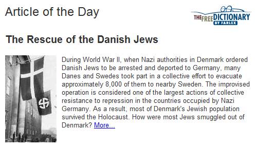 ![]() The Rescue of the Danish JewsDuring World War II, when Nazi authorities in Denmark ordered Danish Jews to be arrested and deported to Germany, many Danes and Swedes took part in a collective effort to evacuate approximately 8,000 of them to nearby Sweden. The improvised operation is considered one of the largest actions of collective resistance to repression in the countries occupied by Nazi Germany. As a result, most of Denmark's Jewish population survived the Holocaust. How were most Jews smuggled out of Denmark? More... | |