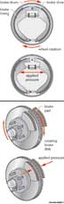 Noun | 1. | disc brake - hydraulic brake in which friction is applied to both sides of a spinning disk by the brake padsbrake disk - a disk or plate that is fixed to the wheel; pressure is applied to it by the brake pads brake pad - one of the pads that apply friction to both sides of the brake disk hydraulic brake, hydraulic brakes - brake system in which a brake pedal moves a piston in the master cylinder; brake fluid then applies great force to the brake pads or shoes |