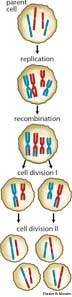 top to bottom:In meiosis a parent cell replicates and recombines, divides once to create two daughter cells, then divides again creating four daughter cells, each of which has half the genetic content of the original parent cell.